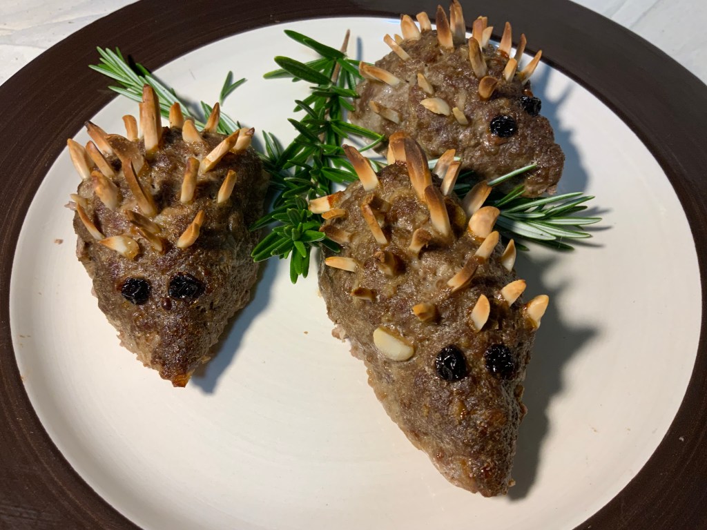 I was unemployed, and wanted to make something showy but inexpensive for a Stormhold (SCA Melbourne) pot luck feast. So I made up some rissoles, just as I would for home dinner, and decorated them with currants for eyes and slivered almonds for hedgehog spines.