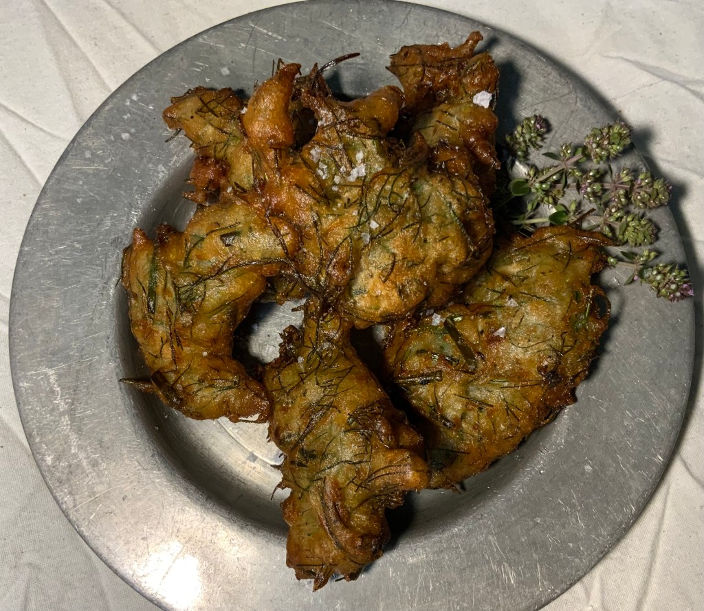The recipe (“frytour of erbes”) is from Forme of Cury: